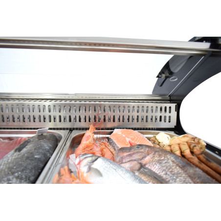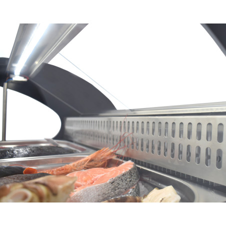 A diferencia de las vitrinas convencionales, este equipo está fabricado en acero inoxidable AISI-316, un material anticorrosivo de alta calidad indispensable para el contacto directo con la salinidad del marisco y el pescado. Su diseño permite la exposición directa sobre la cuba, permitiendo crear camas de hielo picado para una presentación tradicional y ultra-fresca.
