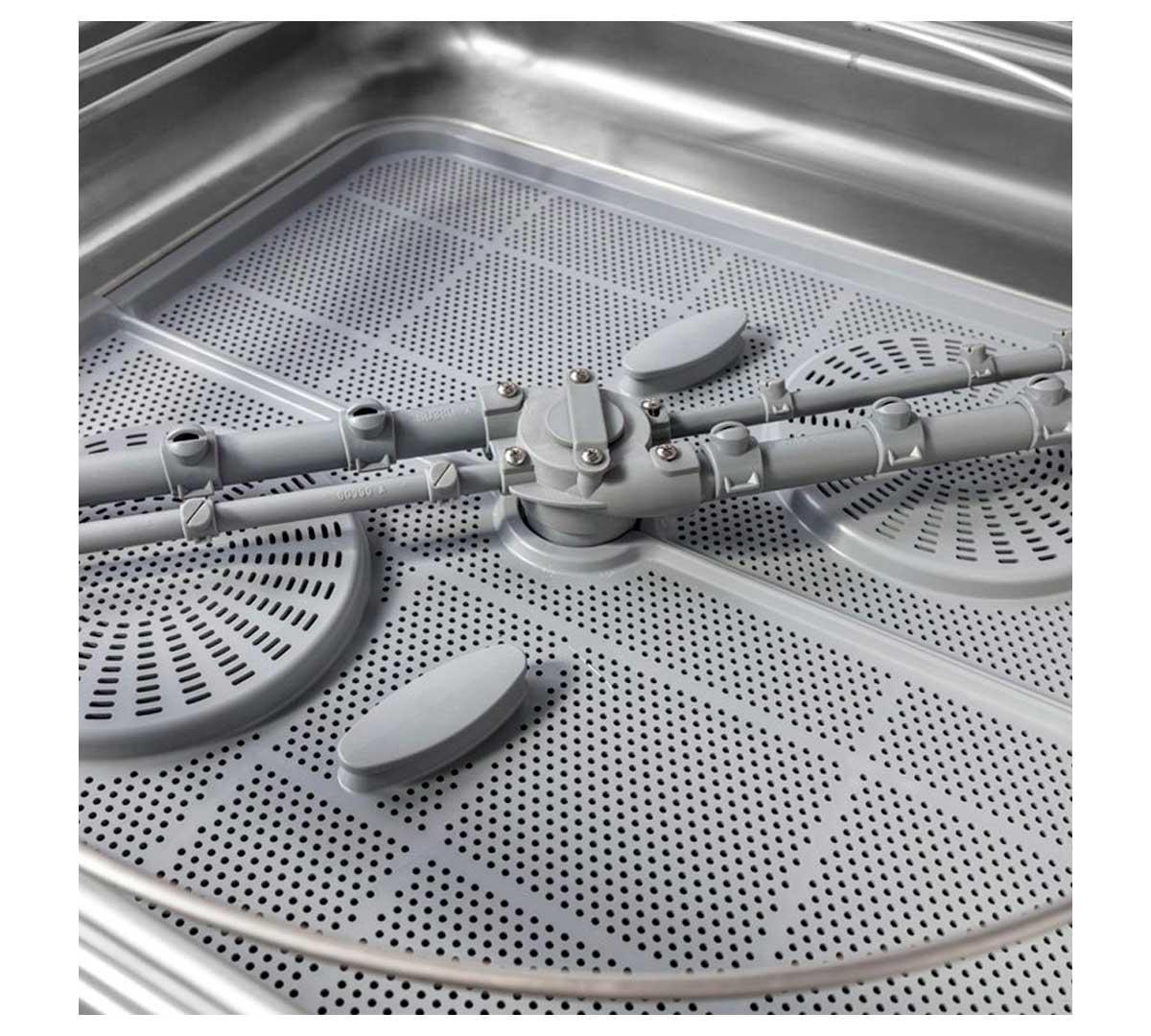 El lavavajillas incorpora brazos de lavado y aclarado superiores e inferiores en acero inoxidable, garantizando una distribución homogénea del agua y evitando problemas de corrosión.