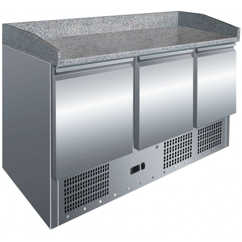 La Mesa de Preparación de Pizzas LPK S903PZ es la solución definitiva para pizzerías y cocinas de alto volumen que necesitan maximizar su capacidad de almacenaje y área de trabajo. Con unas dimensiones de 1365 x 700 x 1050h mm, este equipo ofrece una amplia superficie de granito de gran resistencia, ideal para el boleado y estirado de masa gracias a su durabilidad y mantenimiento de temperatura.